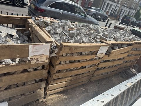 Posted by. Peter M 4 pallet-sized crates of grey granite setts. Dimensions of each sett 50mm x 100mm x 100mm approx (natural split) Available for pickup from 43 Langdon Park Road, N6 5PT Location Langdon Park Road, London, Greater London, N6 5PT what3words watch this item contact the seller Share this post