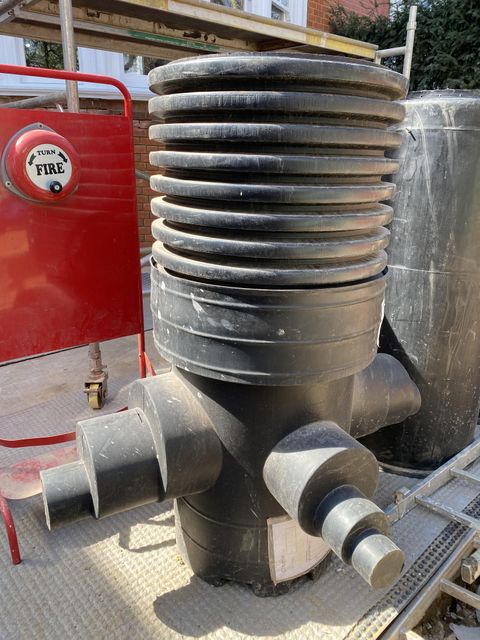 This Accesso catchpit chamber: Model – AICCP600B – has a Ø 600mm rotational moulded chamber base with either 160mm smoothwall, or 225-300mm twinwall main channel socket connections, it also includes two further 110-160mm smoothwall or 225mm twinwall side inlets at 90° and 270° from the outlet at 0°, which are provided as blanked ends for use as required.
