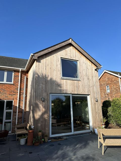 Cladding is Douglas fir “Machined to shadow gap T&G profile, 95mm face width, 5mm shadow gap and 20mm finished thickness”. It’s grade B.