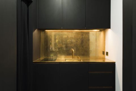 A Jack Trench kitchenette, refined, fully integrated kitchenette combining solid brass and Richlite Black Diamond Doors with American Black Walnut cabinetry.