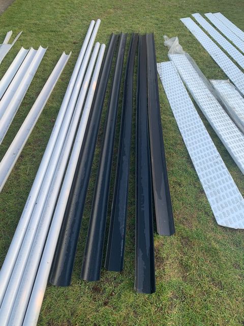 Job lot of new items from Eurocell. Have been stored outside for 6 months. Including: 7 x 5m lengths white PVC cladding, 3 x 5m lengths 15cm capping board, 1 x 5m length 20cm capping board, 1 x 3.2m length 25cm capping board (also two off cuts of this: 2.5m each), 2.5m length 6.5cm square gutter pipe, 2 x 4m long downpipe, 2 x 5.5m long downpipe, 2 x 4m long round guttering (black), 2 x 4m long square guttering (black), 1 x 3.7m long square guttering (brown), 1 x 4m long square guttering (white), 2 x 4m long round guttering (white), 1 x 3m long round guttering (white), 8 x 3m long white trim, 12 x 2.5m long white trim. Three window frames, some scratches as shown in photos; Grey window frame 91.5cmx87cm and window board, Grey fully opening frame 122.5x101.5 and window board, White window frame 91.4x88.5 with one part opening. Worth £1000!