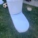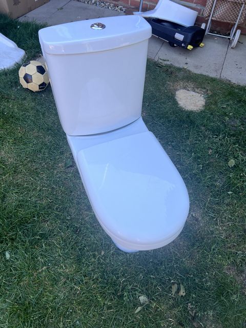 White dual-flush close-coupled toilet with soft-close seat. Features a chrome dual-flush button. Clean, modern rounded design. No cracks, chips or staining. Ideal replacement or for a renovation project.