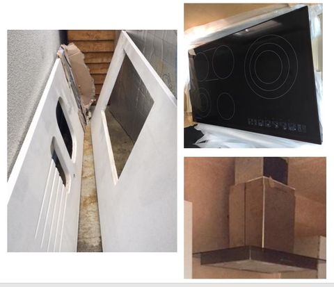 ** 3 lengths of Silestone “Blanco Dune” quartz worktops with splashbacks. Versatile configuration: island, U-shaped, L-shaped or galley kitchen. Cut-outs for 2 sinks, tap and 900mm hob. Off-white with tiny flecks of grey, beige and tan. Ceiling extractor fan for island, (though can be used with any hob).