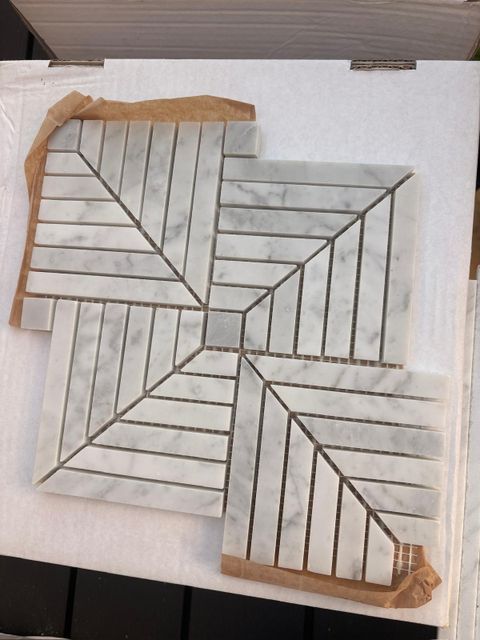 GENUINE MODERN CARRARA THASSOS HONED MESH BACKED TILES TOTAL 8.7M2. Geometric Mosaic Tiles - Mesh Backed come in a total of 10 boxes, each containing white tiles with grey veining. Measuring 300mmx300mm, these natural stone and marble tiles are perfect for adding a modern and stylish touch to your walls. The geometric pattern gives a sleek and contemporary look, making them a great choice for any room in your home. Perfect for DIY enthusiasts looking to enhance their space with a high-quality and distinctive flooring option. Please note 9 boxes contain 10 tiles, 1box contains 7 tiles - total of 97 tiles. TOTAL COVERAGE 8.7M2. To be sold as one, unless requested otherwise. !!RETAIL PRICE IS £300+ per m2 - selling whole 8.7m2 for £750!!! COLLECTION FROM CLIFTON, BEDFORDSHIRE