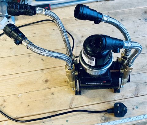 Salamander 3.0 Bar Twin Impeller Universal Head Shower Pump - CTFORCE30TU. Used less than 1 year - in perfect working order - removed as redundant after a pressurized HW tank installation. Comes complete with 4 attachment hoses and electrical plug installed. Over £420 new.
