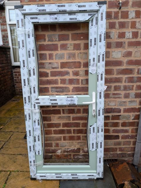 A uPVC back door which has never been installed. Outside colour is Churwell Green, with white on the interior.